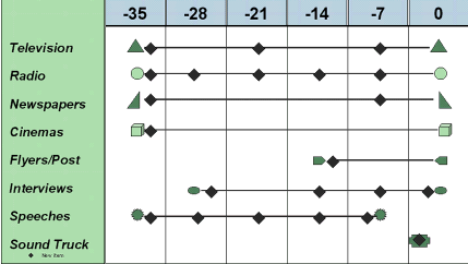 There should be a central theme for all materials used by the media. The media should be coordinated and complement each other. The materials should be launched (released) in waves (phases) to coincide with electoral events. The launch dates may vary by media and should depend on the content of the message and intended targets. The scheduled launch dates should also consider the variables of media access to geographic areas.