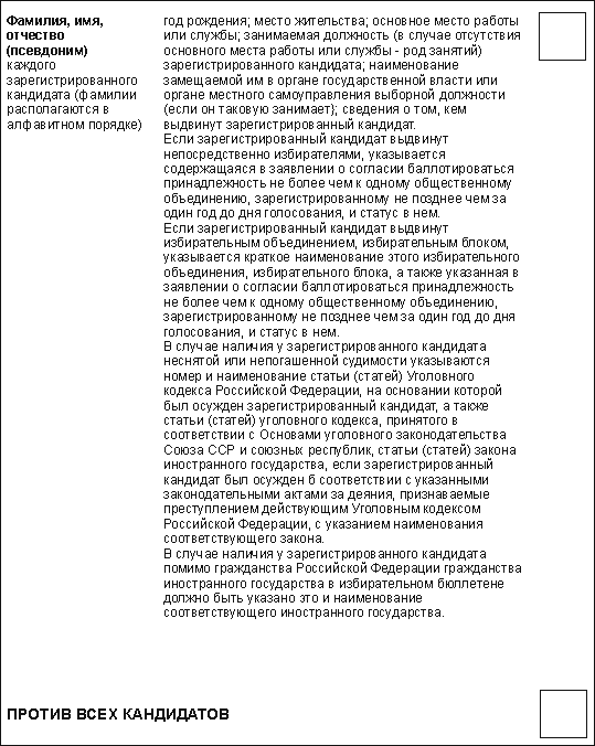 Поставьте любой знак в пустом квадрате справа от фамилии только одного зарегистрированного кандидата, за которого Вы голосуете, либо в квадрате, расположенном справа от строки «Против всех кандидатов».