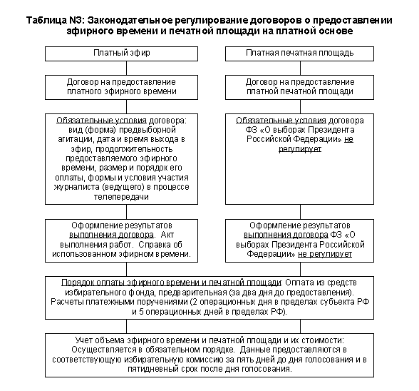 Таблица N 3: Законодательное регулирование договоров о предоставлении эфирного времени и печатной площади на платной основе